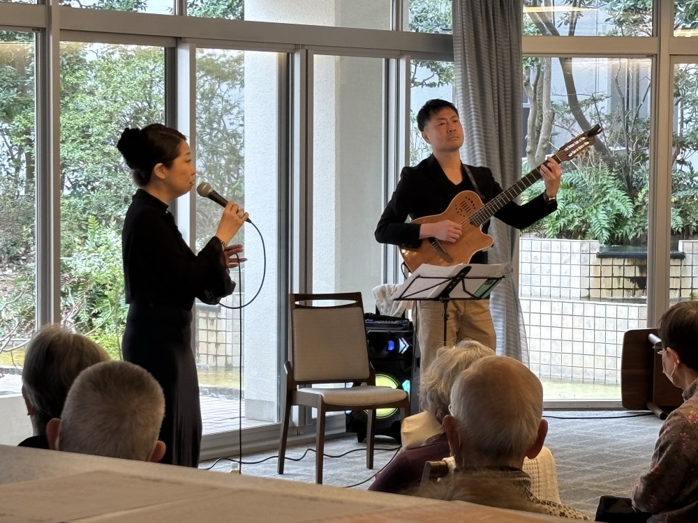 シンガーとギターによるジャズコンサートをロビーで開催。スタンド・バイ・ミーなど計7曲の歌を披露いただき、昼下がりにジャズの心地よい時間を過ごされました。