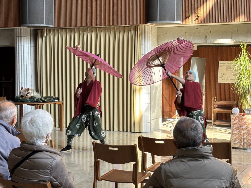 色々なメディアにも出演されている丸一仙翁社中の方仙若さん・鈴仙さんにお越しいただきました。見事な曲芸と寿獅子舞のめでたい振る舞いで縁起の良いイベントとなりました。