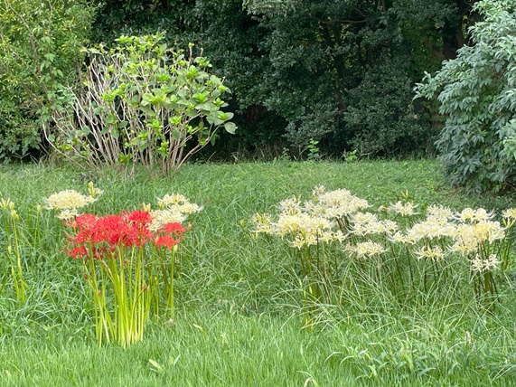 中庭には紅白の彼岸花。 白の彼岸花は咲かない年もあります。