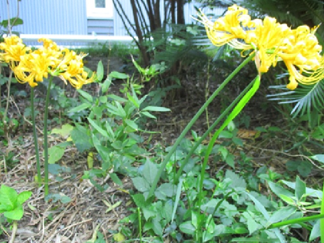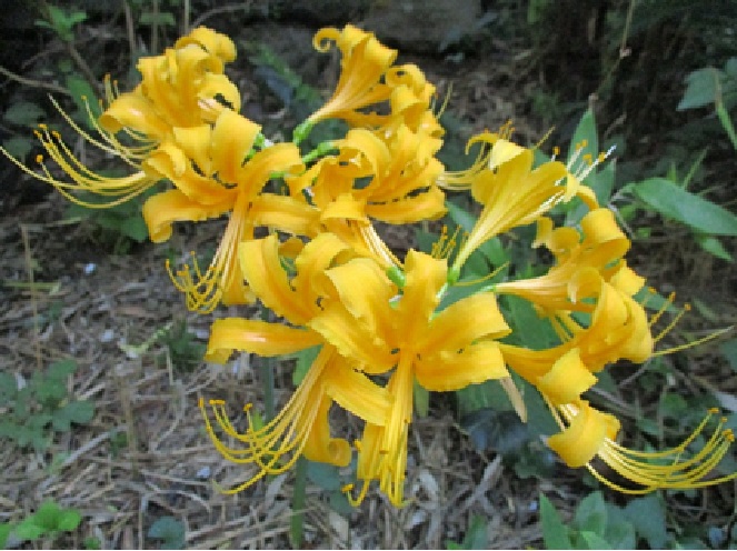 彼岸花より遅れて咲き出すこちらの鮮やかな黄色の花は、ショウキズイセンと呼ばれ、彼岸花の園芸種で、赤い彼岸花よりも花が少し大きく、花弁が波打っています。 名の由来ともなっているショウキ(鍾馗)は、中国の民間伝承に伝わる道教系の神様で、日本では、厄除けや学業成就に効果があるとされ、端午の節句に絵や人形が飾られ、ご存じの方もいらっしゃるかもしれません。 確かに鍾馗様のたくわえる長い髭のようですね。