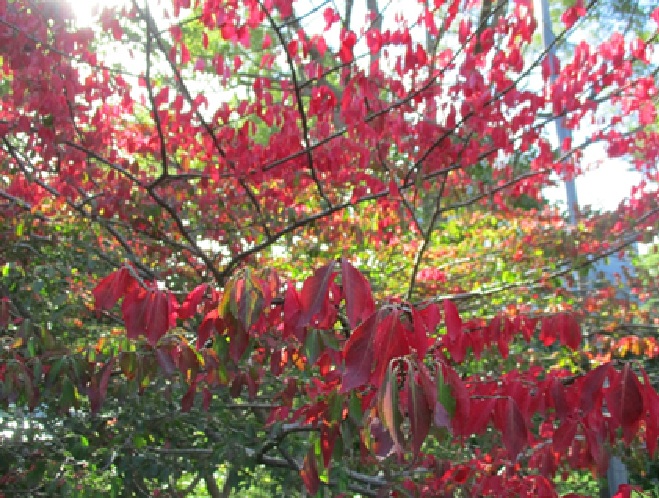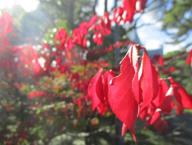 太陽の郷の正門を入ると、ひと際真っ赤に染まる紅葉樹があります。 こちらは世界三大紅葉樹にも選ばれるニシキギです。 秋の野山を彩る代表的な樹木で、紅葉した姿が錦のように美しいことから錦木(ニシキギ)と呼ばれています。 樹高は2~3m程で、古枝にはコルク質の鳥の羽にも見える「翼」を持ち、この翼を刃物や矢になぞらえて、別名「カミソリノキ」とも呼ばれます。