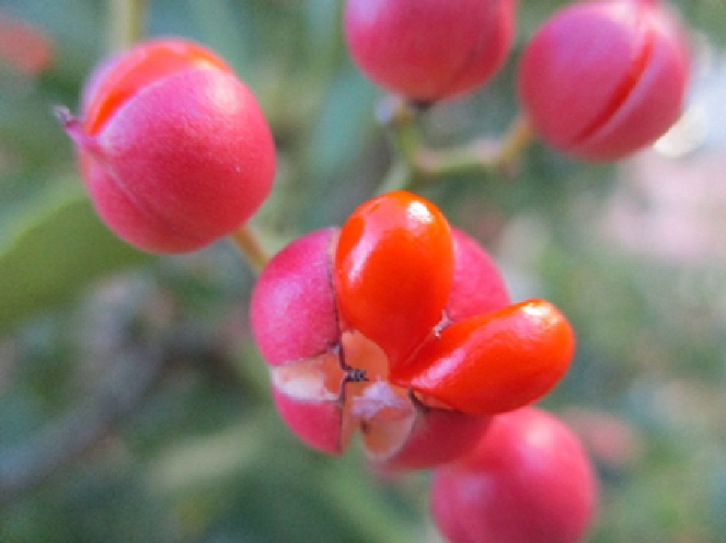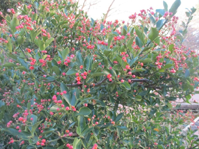 新年明けましておめでとうございます。 今年最初にご紹介する植物は、海岸近くの林によく生えている広葉樹の常緑低木マサキです。 マサキと言えば、新緑の若葉が目に浮かびますが、じつは、花期の6月~7月には多数の小さな緑白色の小花を地味ながら咲かせ、秋につけた実が裂開したこの冬に、郷の庭を陰で彩ってくれる貴重な名脇役なのです。