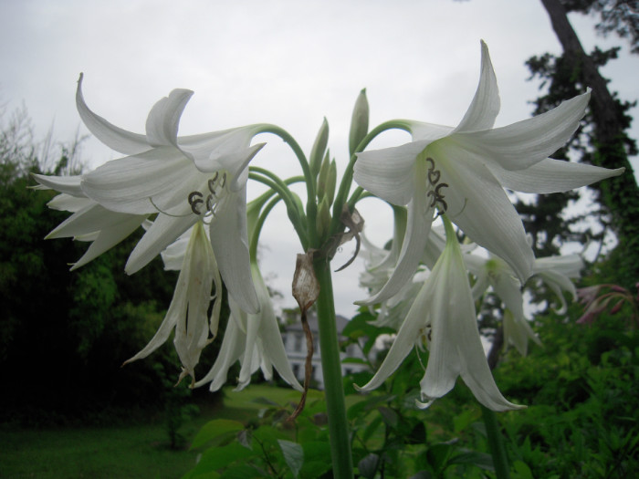 太陽の郷、敷地の西側の梅林近くの園路沿いに咲くお花です。 6月~7月にかけて、白いラッパ状のテッポウユリ似た大きなお花を咲かせます。 アフリカ原産でハマユウに似ていることからこの名が付きました。 明治時代に渡来し、海岸沿いに植えられることが多い植物です。 太陽の郷には白色の他に、ピンク色のハマユウが咲きます。